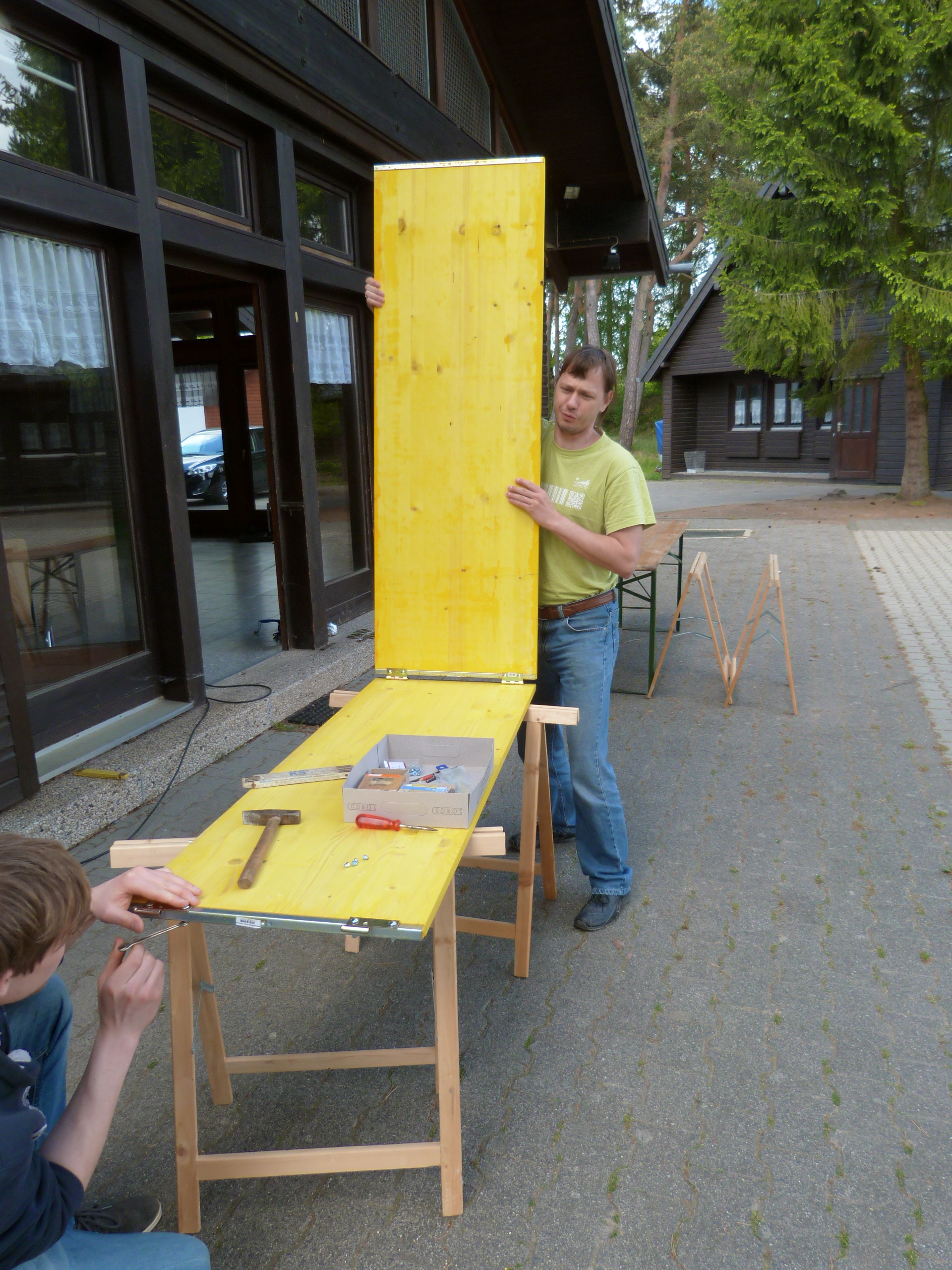 Als praktischen Gegenpart zum Planen wurden Zeltgestänge mit dem Zelt überzogen und weitere neu aufgebaut. Nebenbei entstanden im tatkräftigen Ausgleich die mobilen Banden für Gaga-Ball oder andere zu begrenzende Spiele, wie ein Bällebad für die Kleinsten oder für Baby-Hockey.